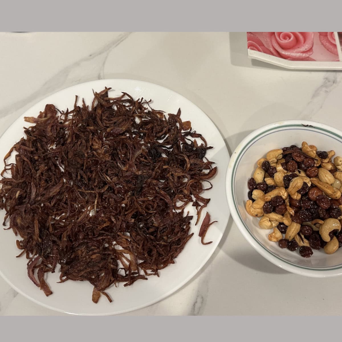 - Step 6: Garnish with fried onions, raisins, and nuts and serve!