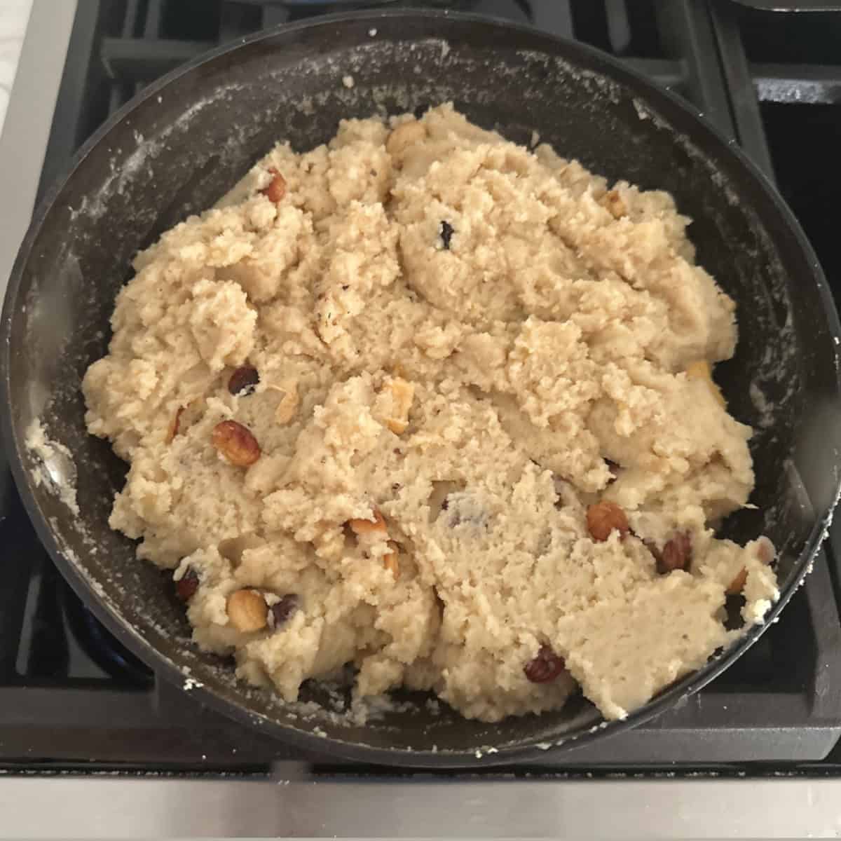 - Roast the cashews, raisins, cream of wheat (rava suji), and wheat powder (optional) until you get a golden brown for about 10 mins.