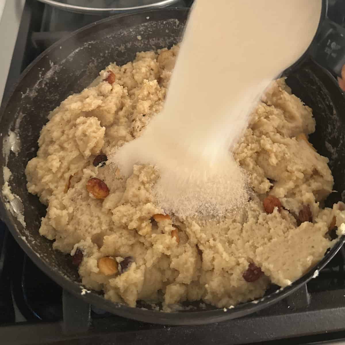 - When the pudding thickens and there are no lumps, add the finely powdered sugar and powdered cardamom seeds.