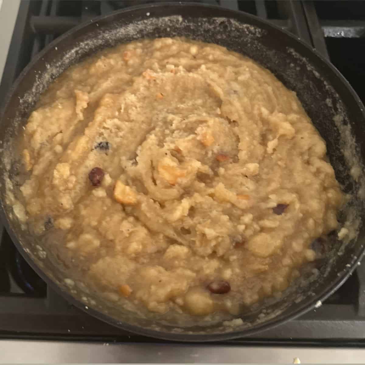 Step 8)Cover and let it cook on low heat, allowing the flavors to blend in and the halwa to thicken. Add a touch more ghee if needed for that signature shine and richness. Turn off the heat once you reach the desired consistency that you like.
