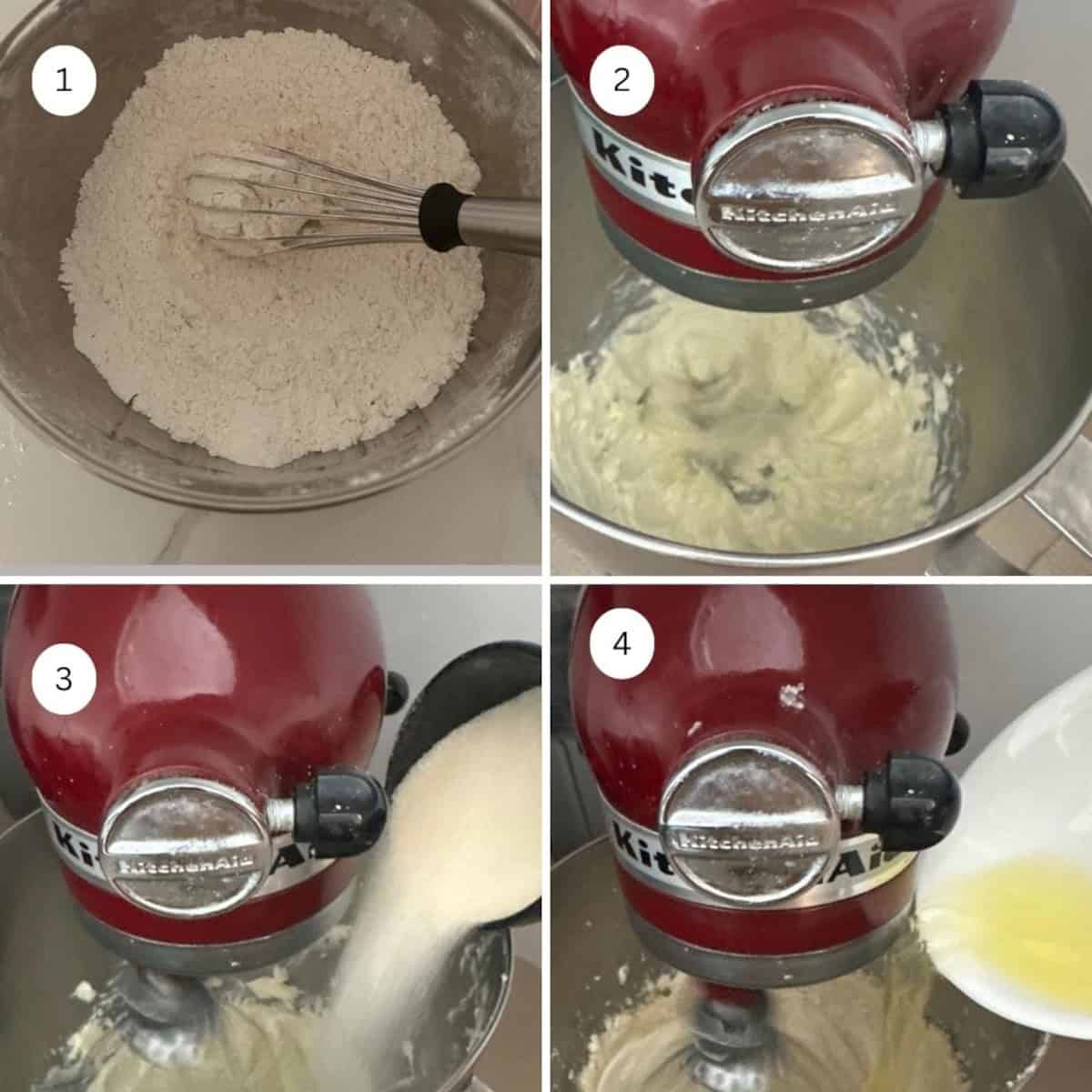 Start by whisking the dry ingredients. Beat the butter on high speed until smooth and creamy. Next, add the sugar and beat on high, then add the egg whites, vanilla extract, and vanilla beans(if using), and beat on medium until combined.